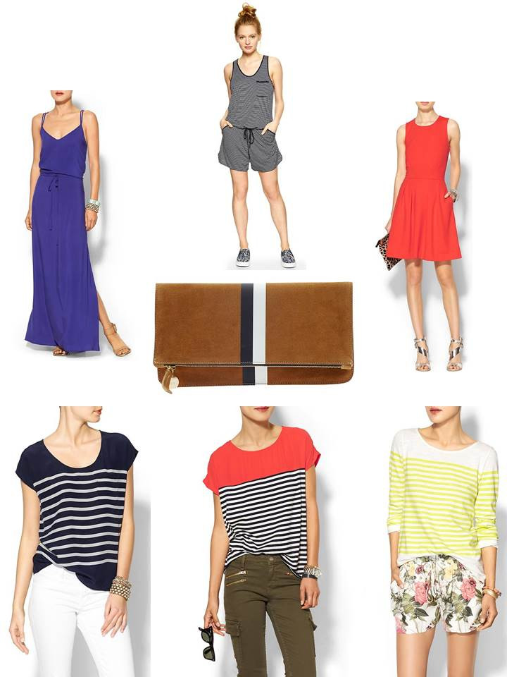 Blue Maxi Dress, Navy Stripes Romper, Red Dress, Clutch, Navy Striped Top, Red and Navy Striped Top, Yellow Stripes Top
